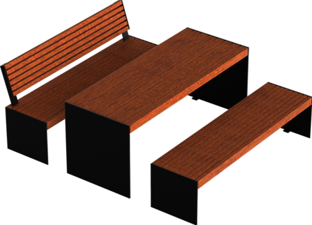 Gestell aus Stahlprofilen, feuerverzinkt und farbbeschichtet, SitzflÀche, Lehne und Tischplatte aus lasiertem LÀrchenholz, Eiche oder Kambala